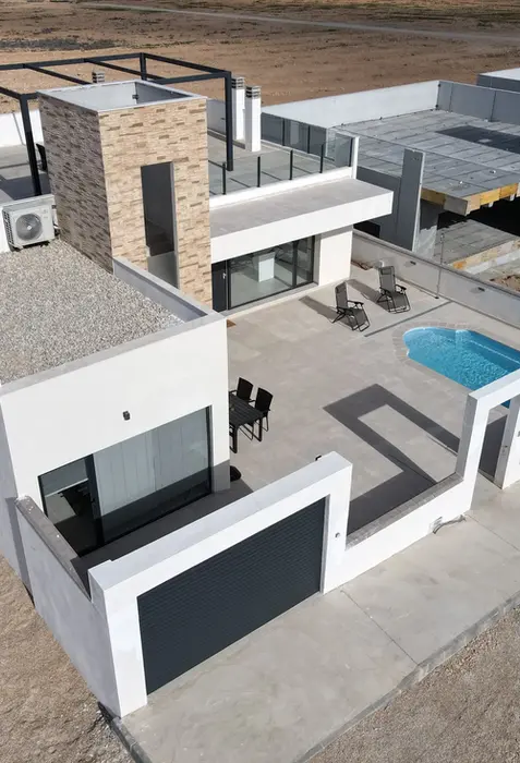 Modern 2 bedroom, 2 bathroom detached villa designed for efficient Mediterranean living. Single-level layout with open-plan living space, private garden, swimming pool and a rooftop solarium, all set on a private plot of approximately 150 m².