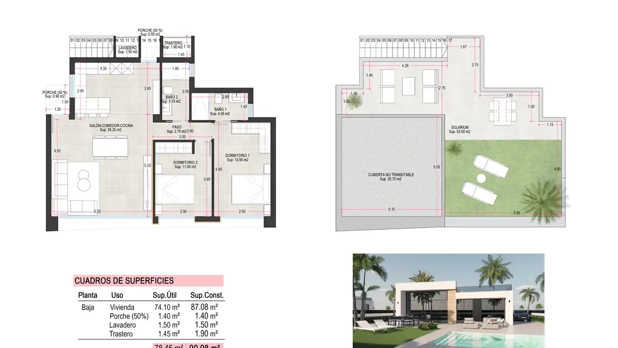 Villa B offers a spacious 3 bedroom, 2 bathroom villa with a built area of 101.54 m², set on plots of approximately 306 m². A 7 × 3 metre private swimming pool and a 64.55 m² solarium are included as standard.